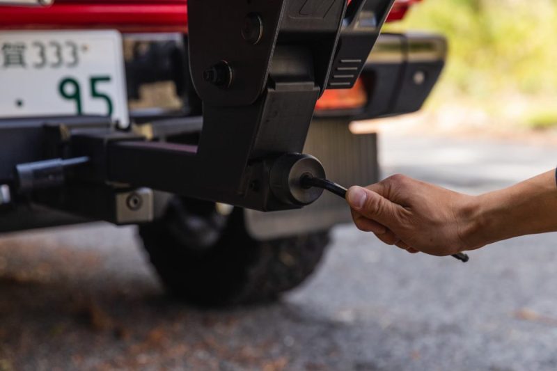 2インチヒッチに差し込んだ時の安定感と折りたたんだ時の佇まいはまさに「機能する芸術品」。